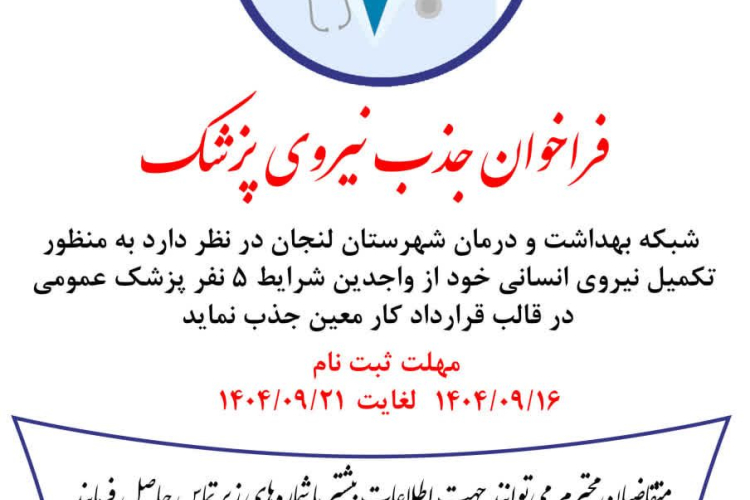 شبکه بهداشت و درمان شهرستان لنجان در نظر دارد به منظور تکمیل نیروی انسانی خود از واجدین شرایط ۵ نفر پزشک عمومی در قالب قرارداد کار معین جذب نماید