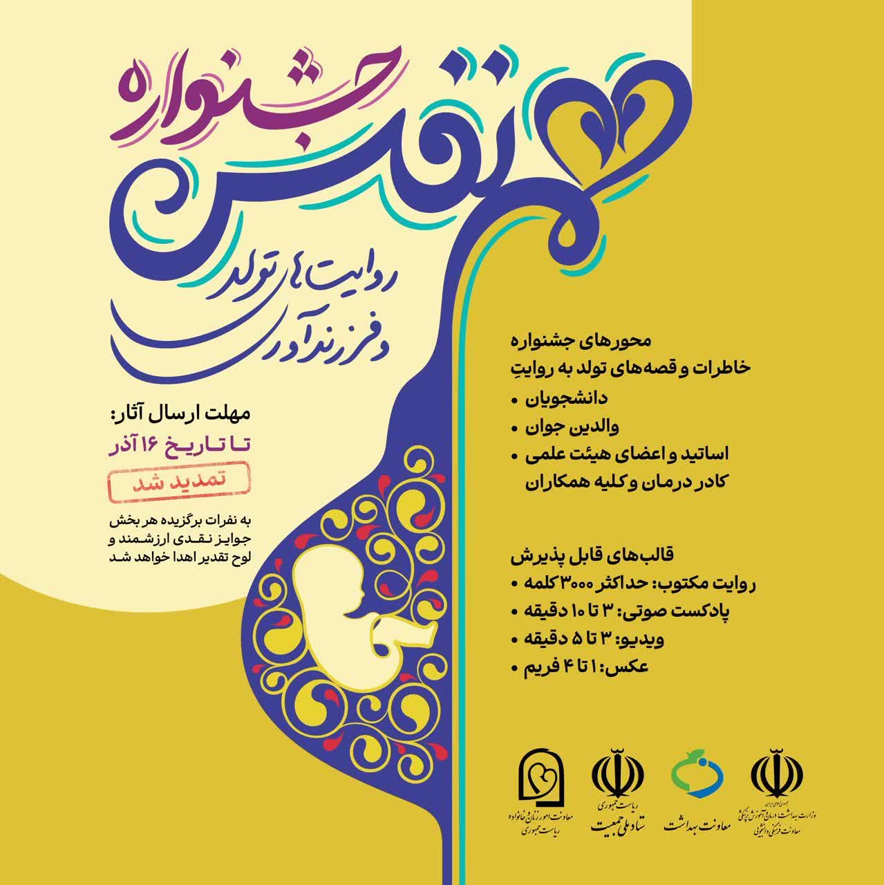 جشنواره "هم نفس:روایت های تولد و فرزنداوری" با همکاری معاونت امور زنان و خانواده ریاست جمهوری، ستاد ملی جمعیت و معاونت بهداشت برگزار می شود، تمدید شد.